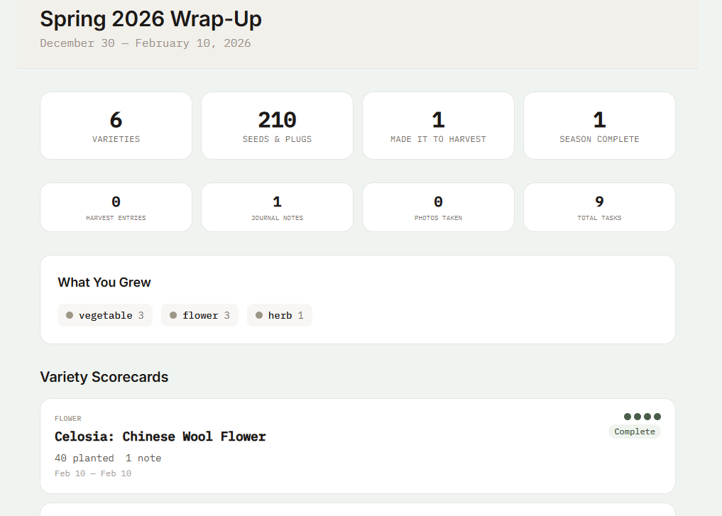 At the end of the season, get a complete summary of everything you planted, harvested, and documented. Score each variety, reflect on what worked, and save lessons for next year.