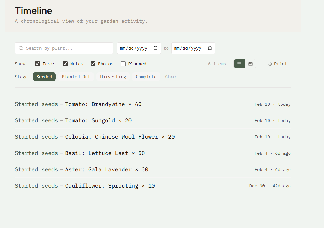 Log when you start seeds, plant out, or direct sow. BeanSprout tracks the lifecycle.